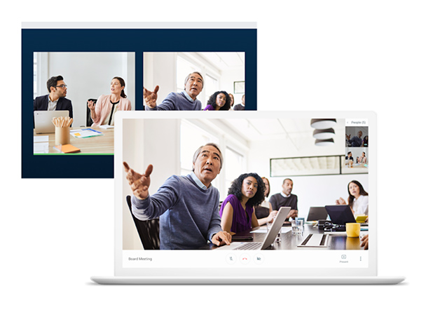 Host Hangouts for up to 25 people within or outside of your organization. The screen automatically focuses on whoever is speaking and intelligent muting prevents background noise.